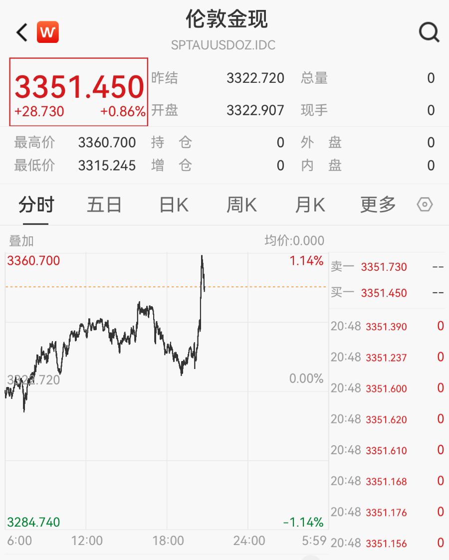 美国5月CPI数据公布后,现货黄金短线冲高12美元,现报3351.45美元/盎司。